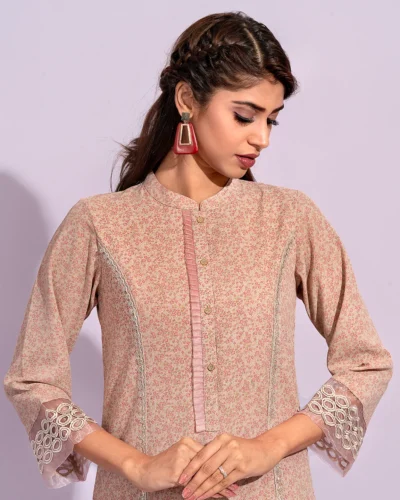 Female Short Kameez With Contrast Pipin & Lace & Details | Peach Pink
