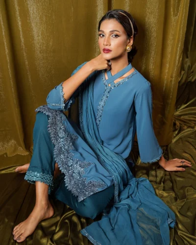 Female Regular Fit Fusion Collar- Neck Long Kamiz | Aegean Blue Tk. 2,916