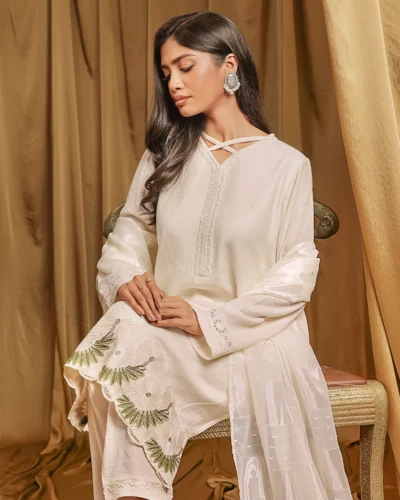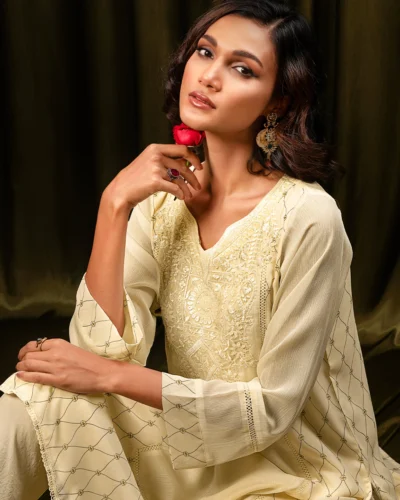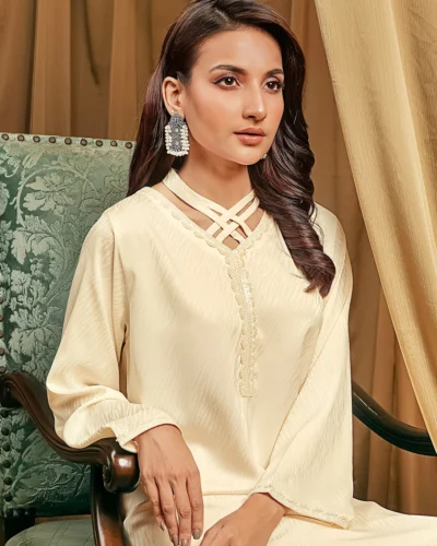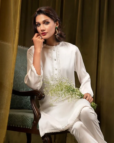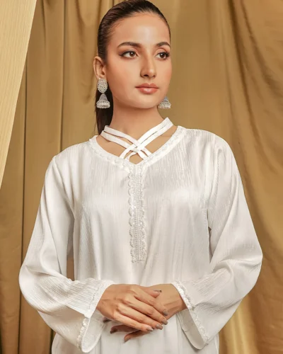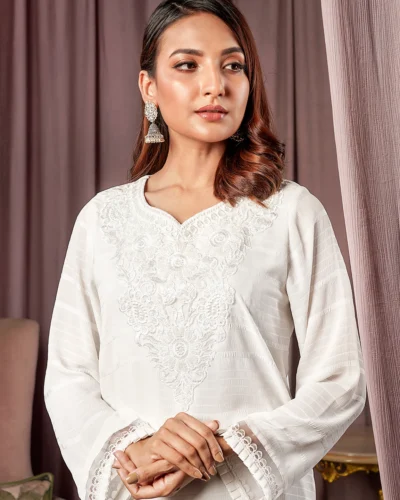 Female Round- Neck Details Short Kamiz | Coconut White Tk. 2,550