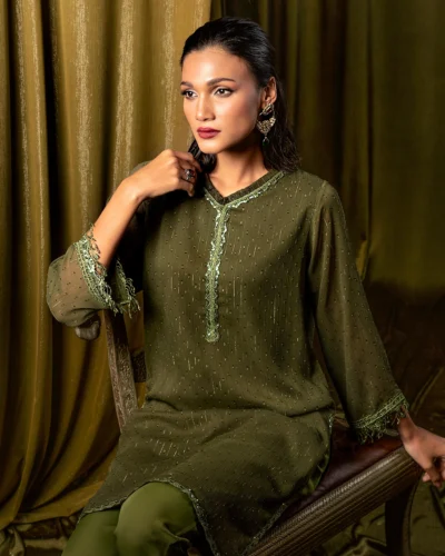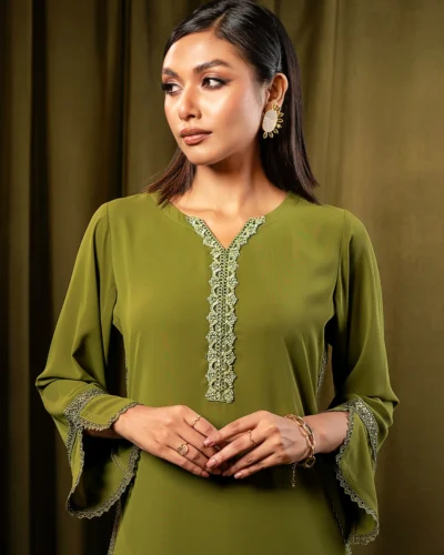 Female Regular Fit Split Crew-Neck Long Kamiz | Olive Green Tk. 2,650