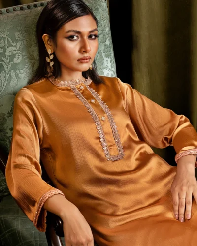 Female Luxury Double Silk Short Kameez | Burnt Ochre Tk. 3,450