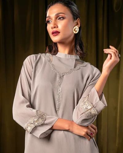 Female Band Collar- Neck Details Fine Crepe Georgette Long Kameez | Peru