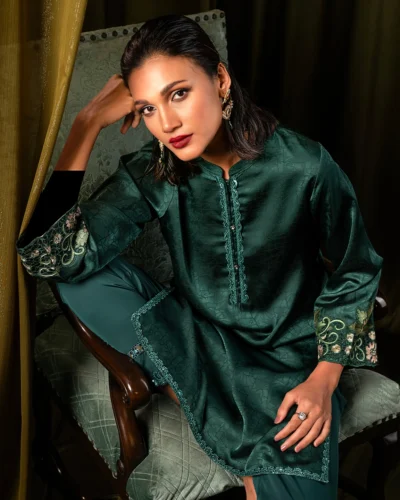 Female Luxury Double Silk Short Kameez | Biridian Green Tk. 3,250