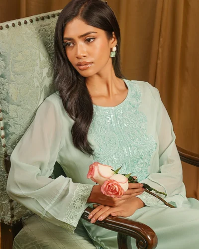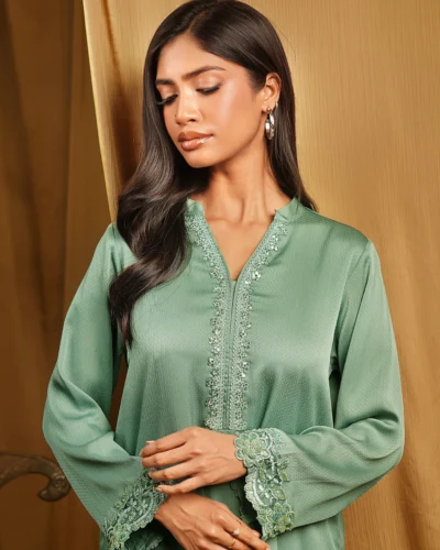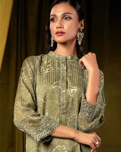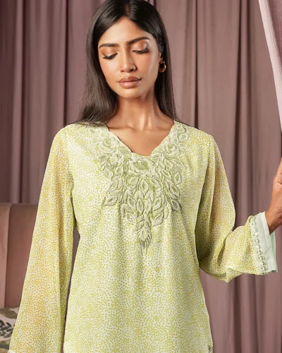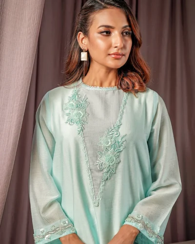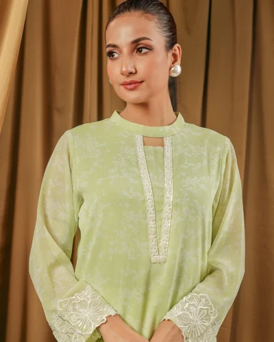 Female Band Collar- Neck Details Short Kamiz | Sage Green Tk. 2,700