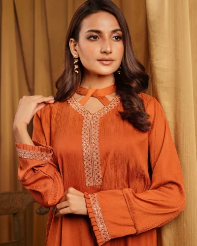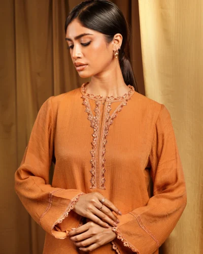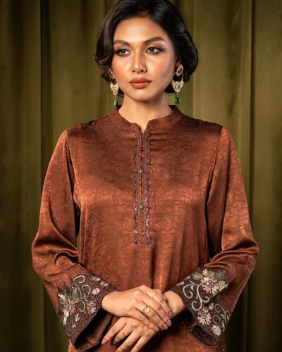 Female Band Collar- Neck Details Short Kamiz | Cinnamon Brown Tk. 3,200