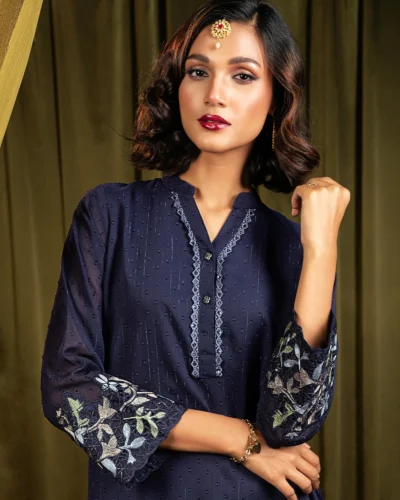 Female Band Collar with Hemline Cut Work Embroidery Lace details Short Kamiz | Navy Tk. 2,750