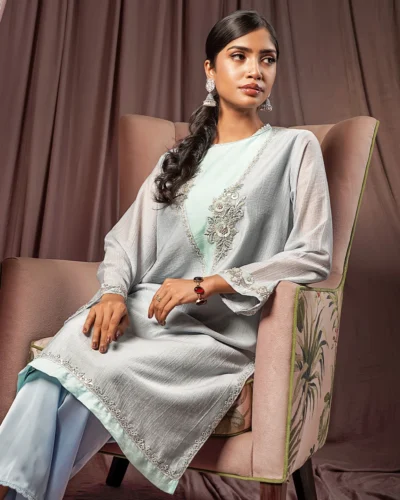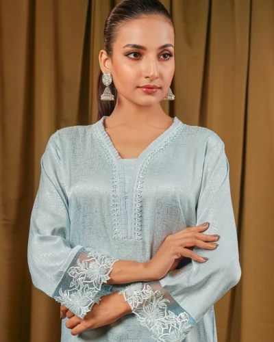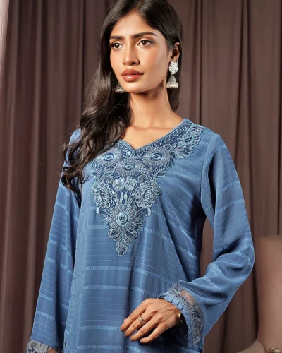 Female Round- Neck Details Short Kamiz | Placid Blue Tk. 2,850