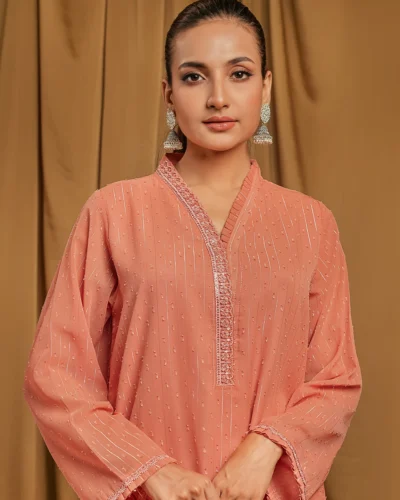 Female Loose Fit V-Neck Details Zari Crepe Georgette Short Kamiz | Coral Blush Tk. 3,250
