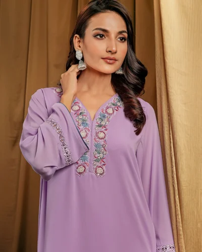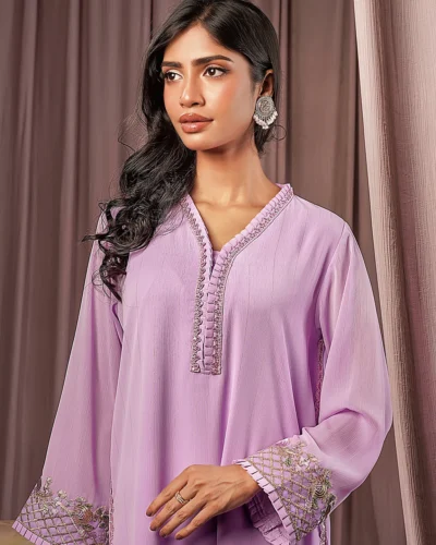 Female Straight Loose Fit V-Neck Details Long Kamiz | Lavender Tk. 2,850