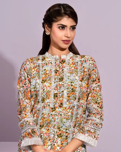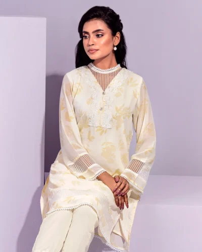 Female Round-Neck Lace & Details Short Kameez | Cream