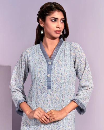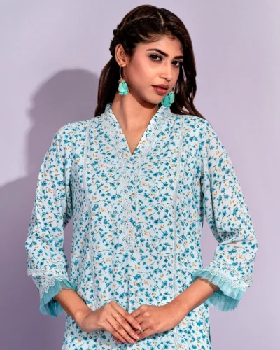 Female V- Neck Lace & Details Long Kamiz | Light Sky