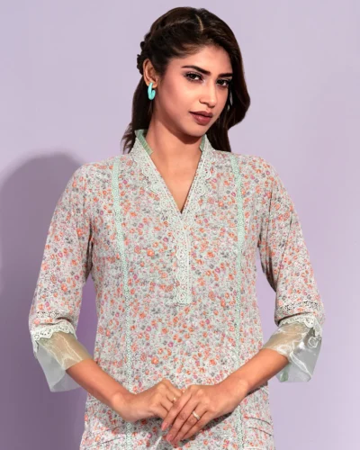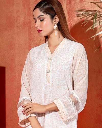 Female V- Neck Lace & Details Long Kamiz | Pepper Mint