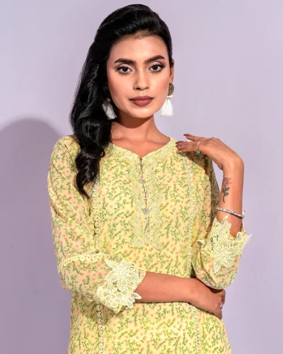 Female Yoke Lace Details & Hand Embroidery Work Short Kamiz | Russian Green