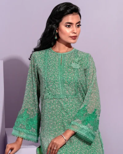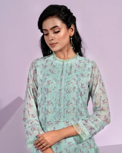 Female Round-Neck Lace & Details Long Kameez | Sea Green