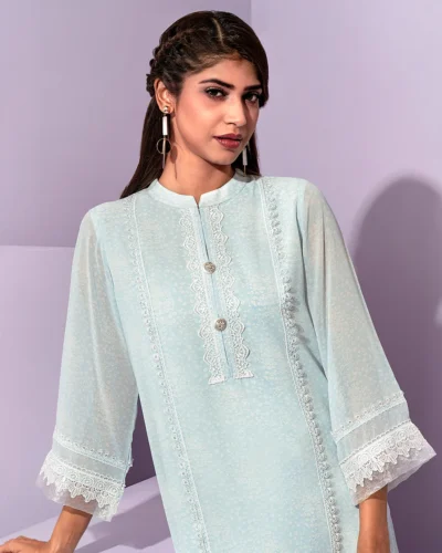 Female Front Yoke Lace Details Long Kamiz | Powder Blue