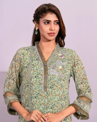 Female Front Part Hand Embroidery Work With Lace Details Long Kamiz | Sage Green