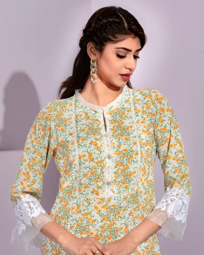 Female Front Yoke Lace Details Short Kameez | Light Yellow