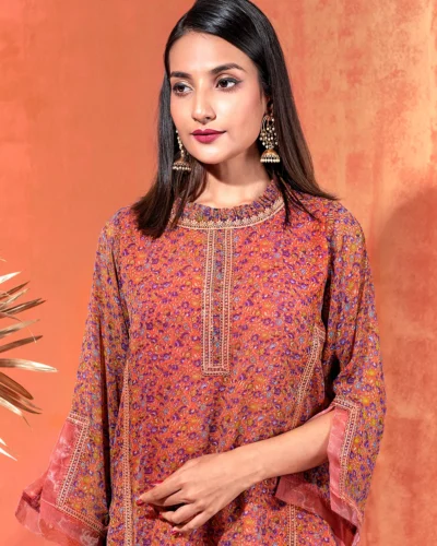 Female Short Kameez With Contrast Pipin & Lace & Details | Peach Pink