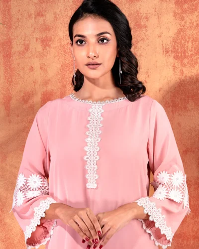 Female Round- Neck Lace & Details Long Kamiz | Pale Pink