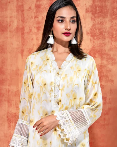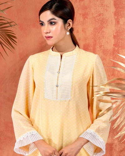 Bend Collar Long Kameez With Lace Details | Yellow Cream