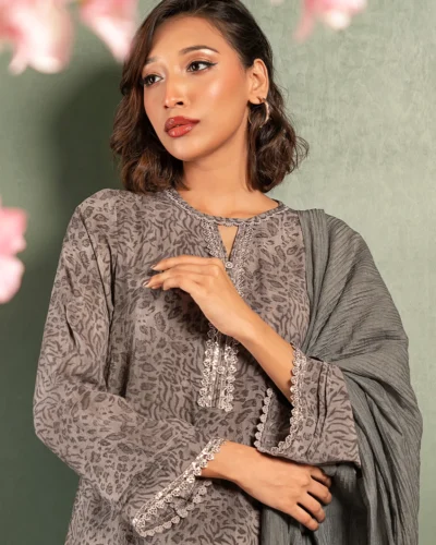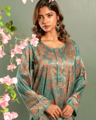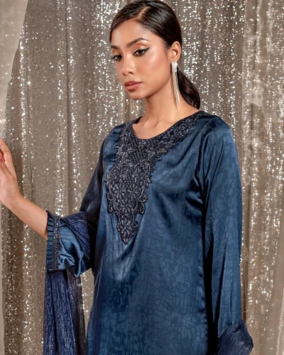 Material: Luxury Double SilkProduct Details :A Bean Blue kameez adorned with an intricate baroque-inspired print and elevated with detailed embroidery along the neckline. The silhouette is finished with delicate trim accents on the sleeves and hem, creating a rich festive look perfect for Eid celebrations and elegant evening gatherings.