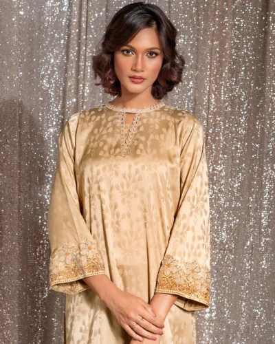 Material: Luxury Double SilkProduct Details : An elegant Golden-toned kameez adorned with subtle all-over woven motifs and delicate embroidery on the sleeves. Finished with refined neckline detailing and a graceful straight silhouette for timeless festive charm.