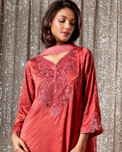 Embroidered Luxury Double Silk Short Kameez | Red Pear Tk. 3,450