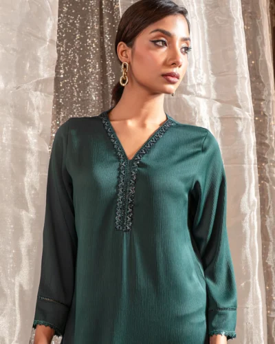 Material: Luxury Double SilkProduct Details : A rich Castleton Green kameez featuring an intricately embroidered statement neckline and delicate trim detailing on the sleeves and hem. Designed in a graceful straight silhouette for refined festive elegance.