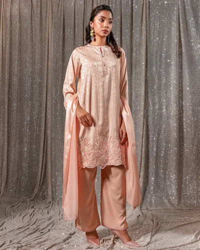 Material: Luxury Double SilkProduct Details : A soft Coral blush kameez adorned with subtle woven motifs and a delicately detailed front placket. Finished with intricate floral embroidery along the hem and refined sleeve trims, creating a graceful and feminine festive look.