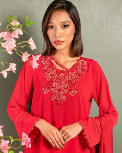 Embroidered Luxury Crepe Georgette Short Kameez | Apple Red Tk. 3,450