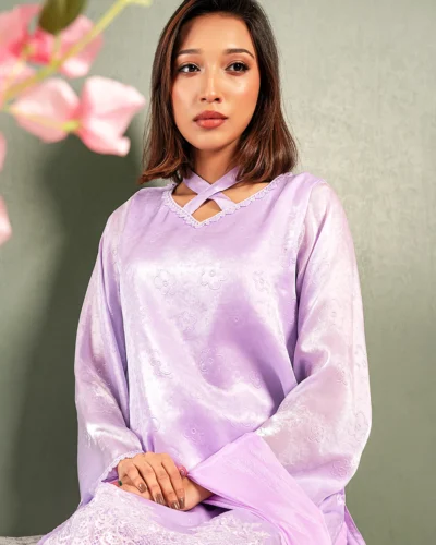 Material: Luxury Double SilkProduct Details :A soft Lavender Mist kameez featuring delicate front detailing and intricate floral embroidery on the sleeves. Finished with subtle lace accents along the hem for a graceful festive silhouette.