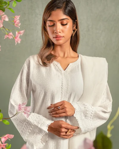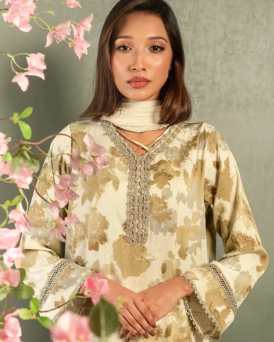 Material: Luxury Double SilkProduct Details : A soft Cloud Cream-toned kameez featuring subtle all-over floral motifs and a delicately embellished neckline with modern cut detailing. Finished with refined lace accents along the sleeves and hem for a graceful festive look.