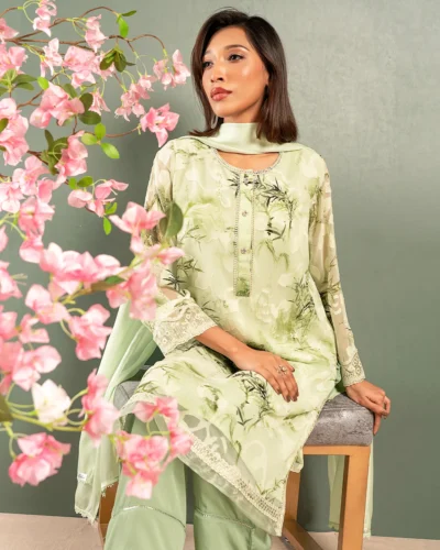 Embroidered Luxury Double Silk Short Kameez | Asparagus Green Tk. 3,400