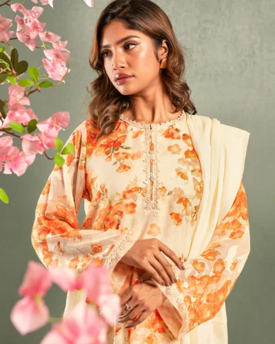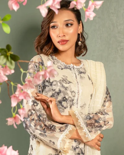 Embroidered Premium Printed Georgette Short Kameez | Cream White Tk. 3,450