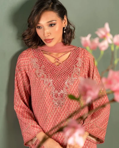 Embroidered Luxury Double Silk Short Kameez | Coral Blush Tk. 3,450