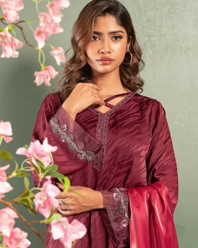 Embroidered Luxury Crepe Georgette Short Kameez | Burgundy Maroon Tk. 3,450