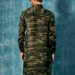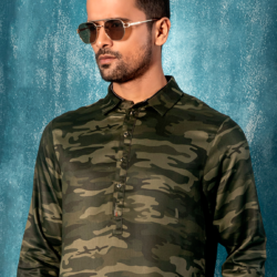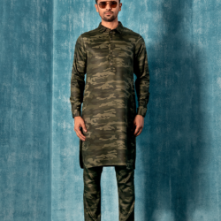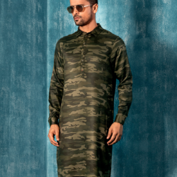 Men’s fancy cotton semi slim fit panjabi For Eid.Classic Band Collar.Inside Placket and shoulder line has decorative stitch. Band has twill tape details. Back yoke has contrast Loop. Sleeve has straight cuff with piping. Round hem.
