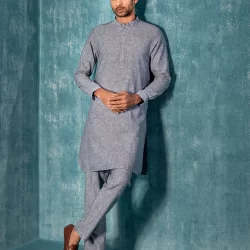 Men’s Luxury Linen semi slim fit panjabi For Eid.Classic Band Collar. Inside Placket with twill tape. Band inside contrast fabric, Button placket has decorative stitch. Band has twill tape details. Back yoke has contrast Loop. Sleeve has straight cuff. Straight hem.