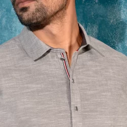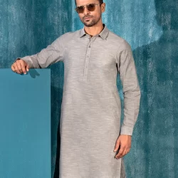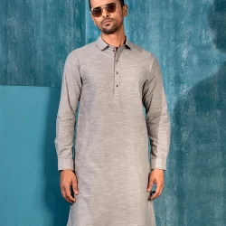 Men’s Luxury Linen semi slim fit panjabi For Eid.Classic Band Collar. Inside Placket with twill tape. Band inside contrast fabric, Button placket has decorative stitch. Band has twill tape details. Back yoke has contrast Loop. Sleeve has straight cuff. Straight hem.
