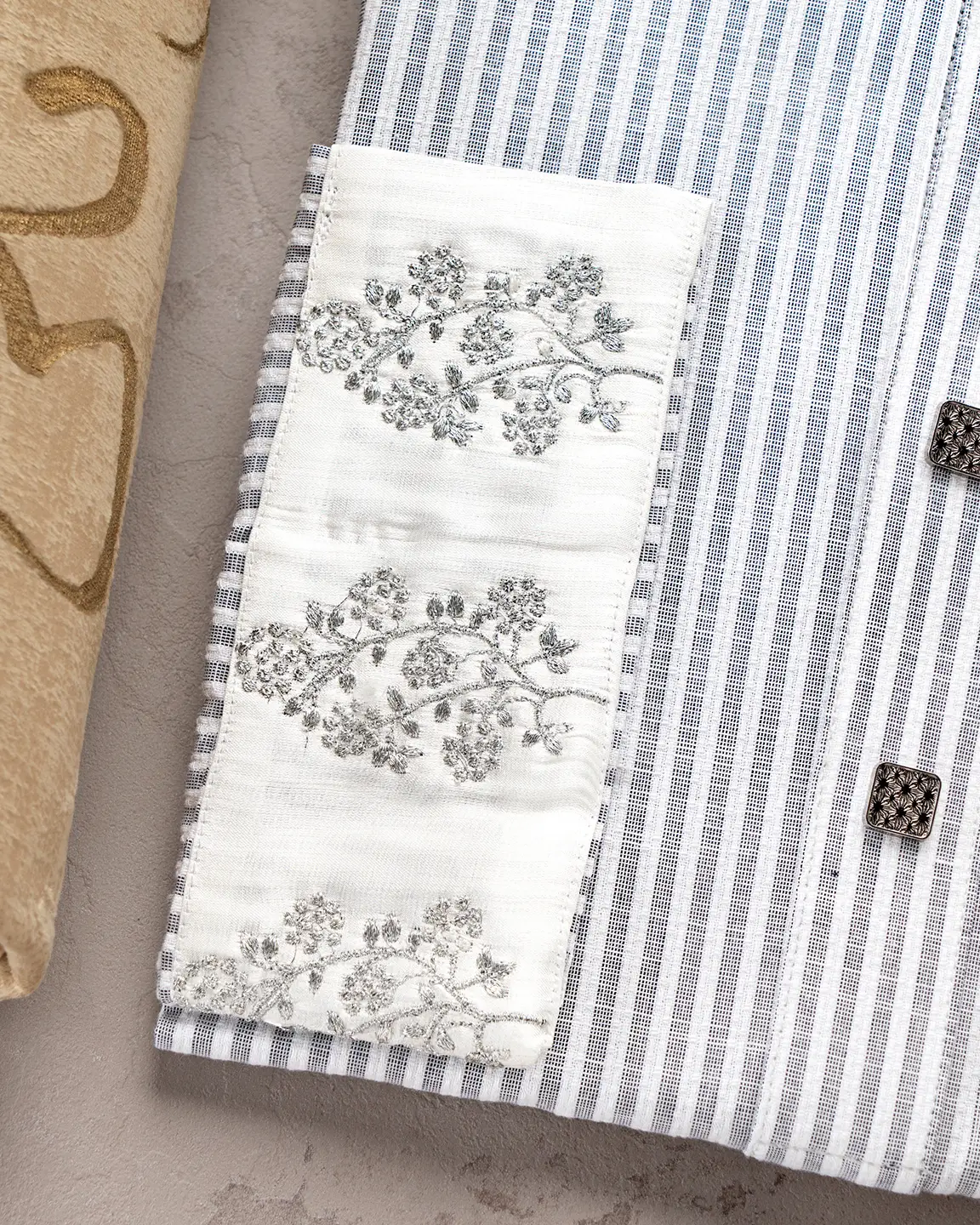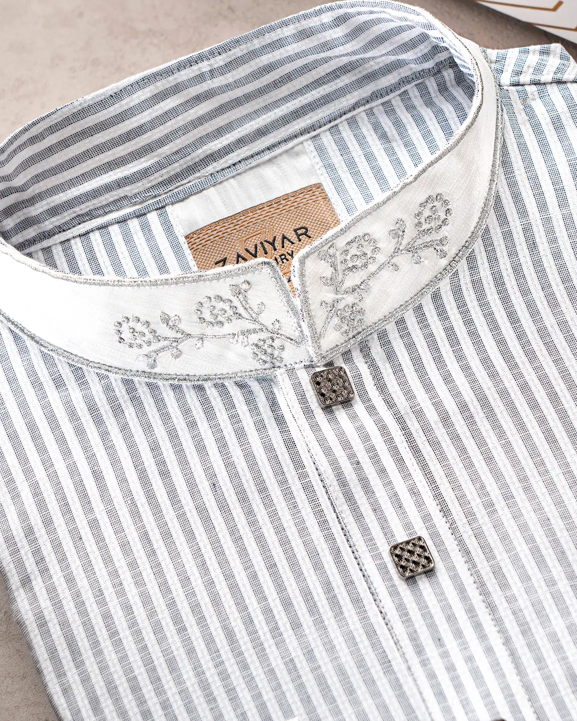 Product Description : Men’s regular fit panjabi with an embroidered band collar and fine piping finish. The front placket is neatly designed and completed with decorative square metal buttons. Matching cuffs feature coordinated embroidery detailing for a clean, premium look.