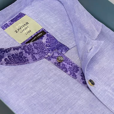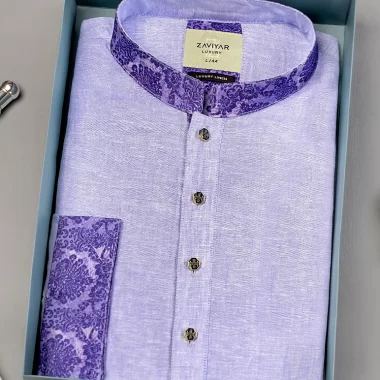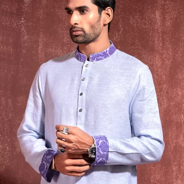 Men’s Luxury Linen regular fit panjabi. Band collar. Collar band with contrast details, Contrast inner placket. Moon has cut & sew contrast design. sleeve hem with contrast on folding cuff. Back yoke with contrast loop, Long Sleeve, straight hem.