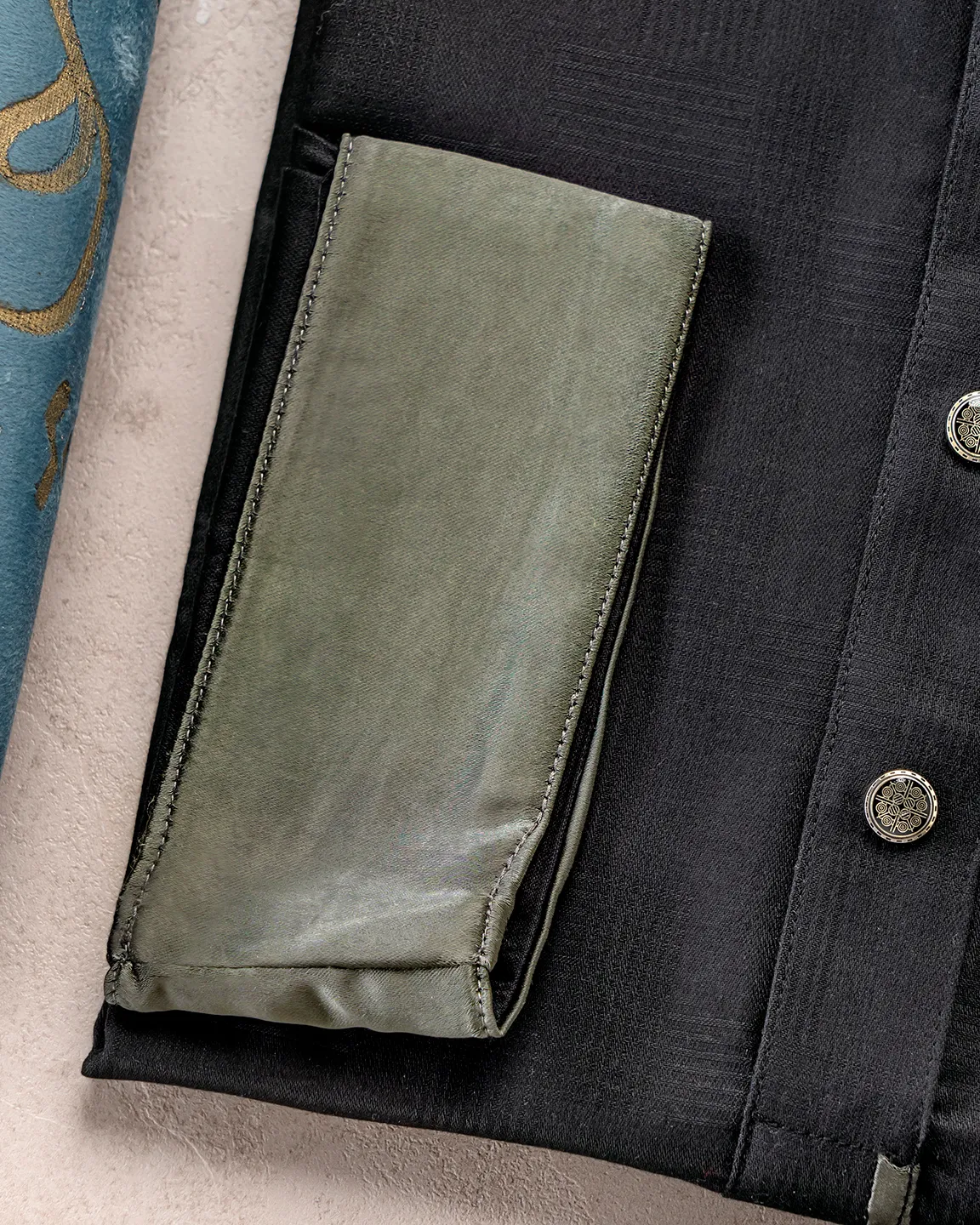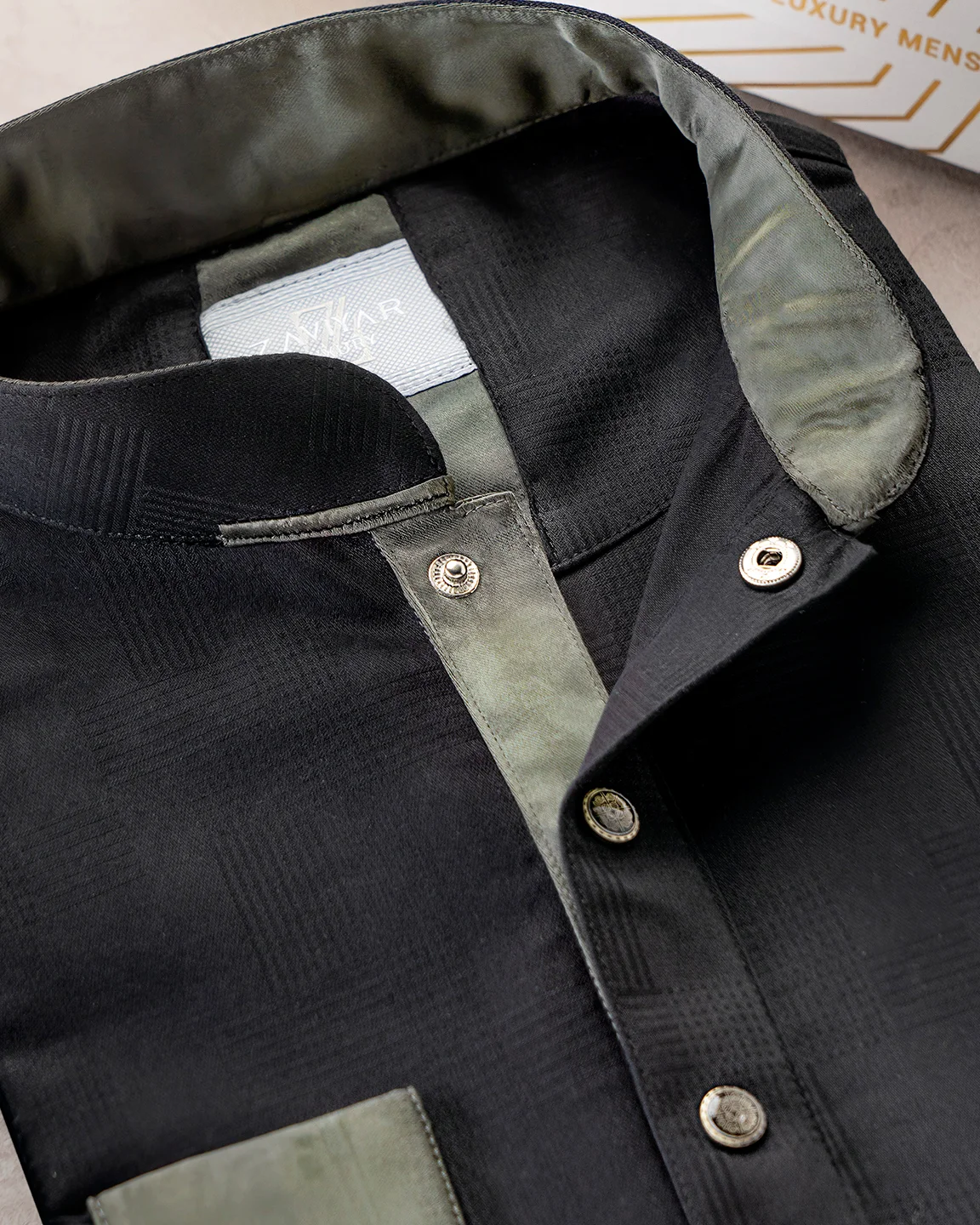 Product Description : Men’s regular fit panjabi featuring a contrast band collar and matching front placket detailing. Finished with decorative metal buttons and coordinated cuffs for a sharp, premium look.