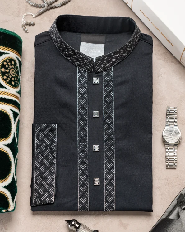 Product Description : Men’s Jacquard Cotton regular fit panjabi For Eid. Band Collar. Collar band & sleeve has embroidery details. Decorative metal show button, long Sleeve, straight hem.