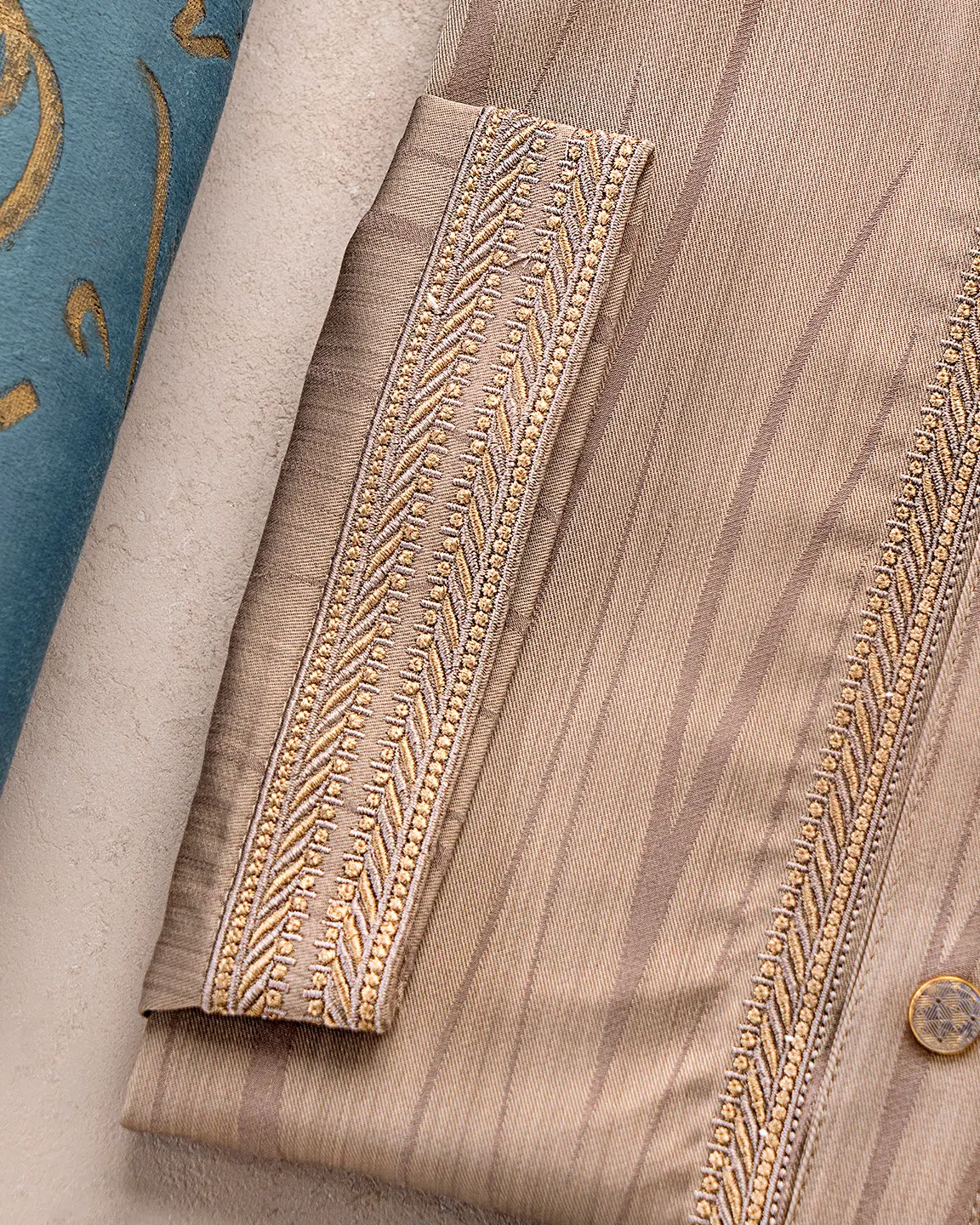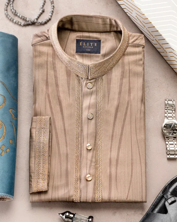 Product Description : Men’s regular fit panjabi with embroidered band collar. The front placket is lined with delicate embroidery and finished with decorative metal buttons. Matching cuffs with embroidery detailing.