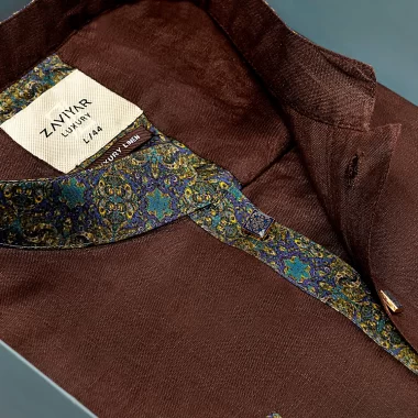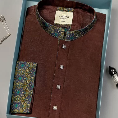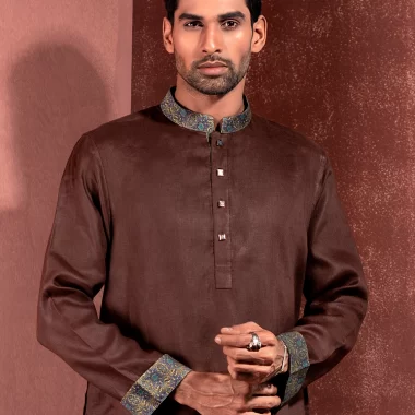 Men’s Luxury Linen regular fit panjabi. Band collar. Collar band with contrast details, Contrast inner placket. Moon has cut & sew contrast design. sleeve hem with contrast on folding cuff. Back yoke with contrast loop, Long Sleeve, straight hem.