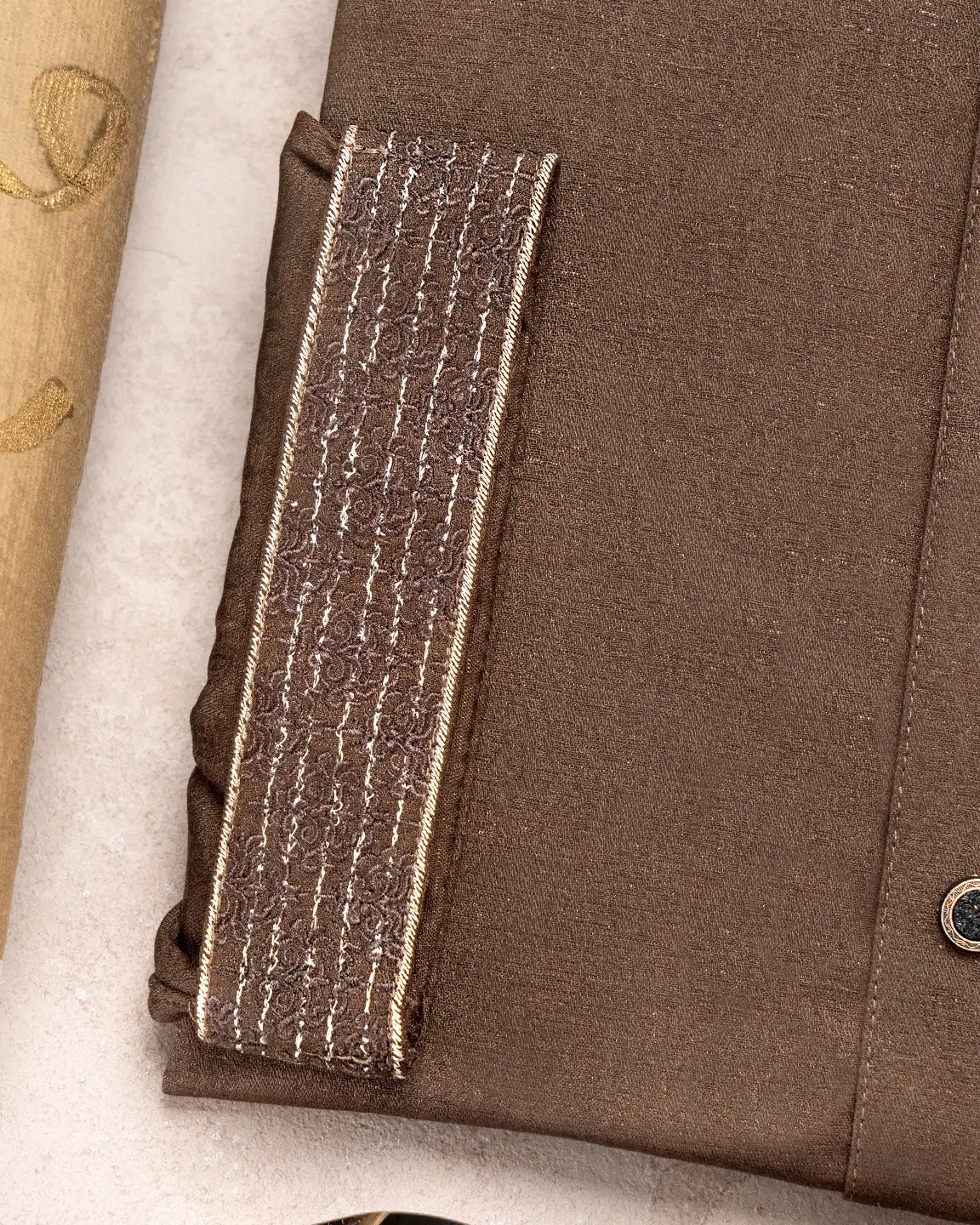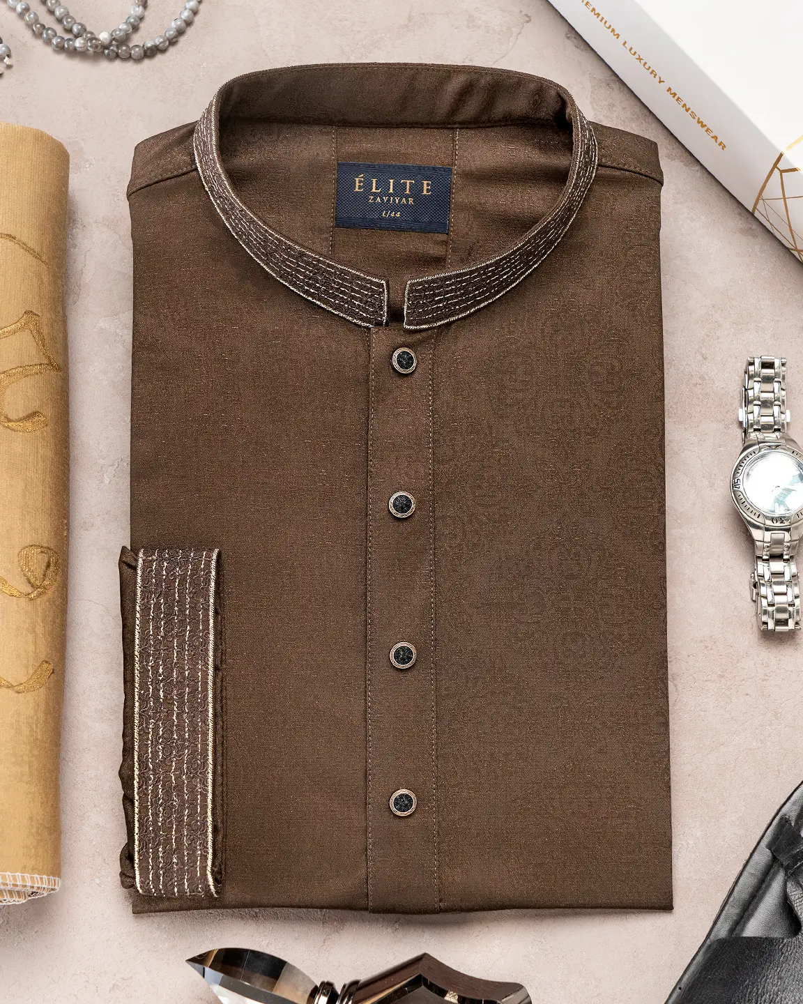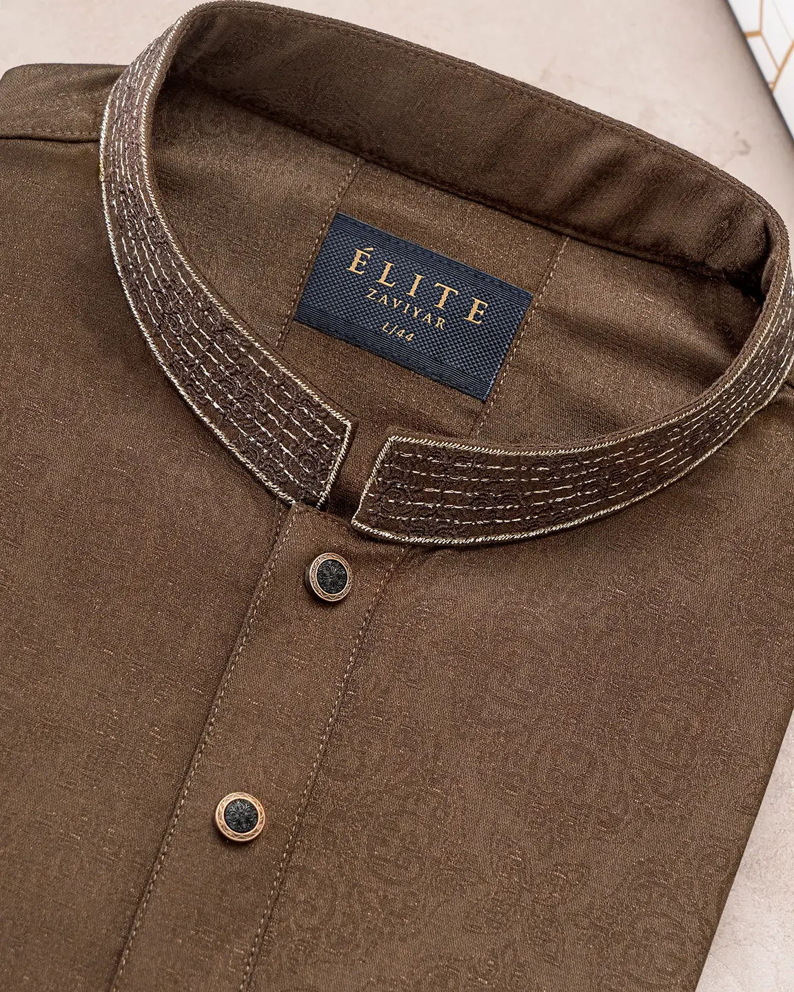 Product Description : Men’s Bamboo Silk regular fit Panjabi For Eid. Band Collar. Collar band & sleeve has embroidery details. Decorative metal show button, long Sleeve, straight hem.