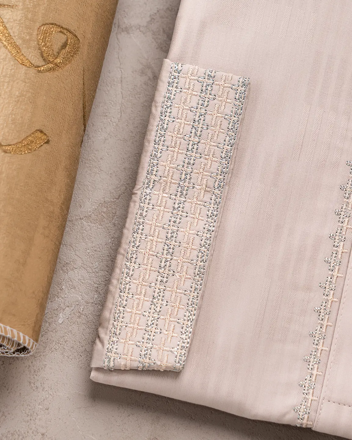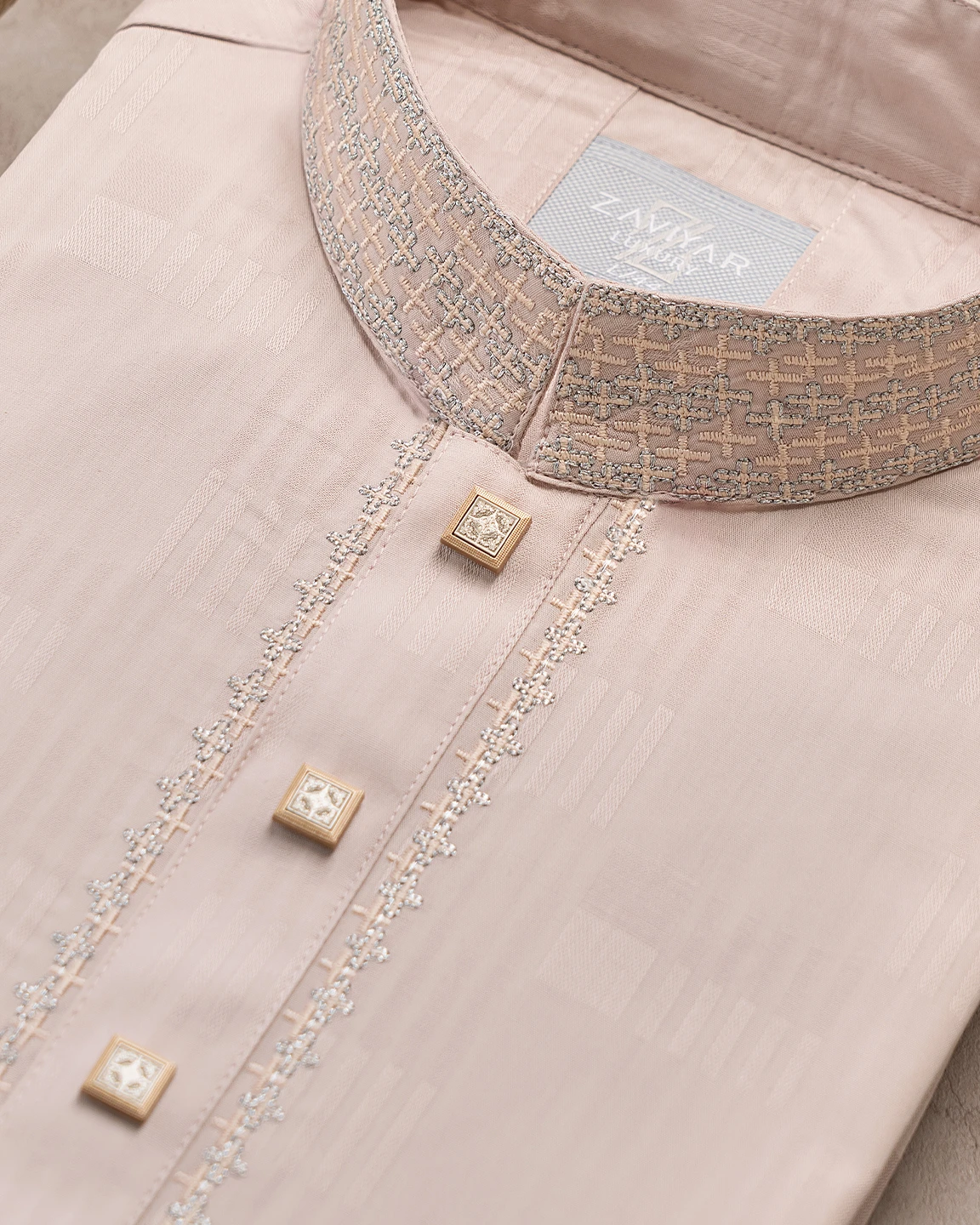 Product Description : Men’s regular fit panjabi with embroidered band collar. The front placket is lined with delicate embroidery and finished with decorative metal snap buttons. Matching cuffs with embroidery detailing. Crafted with fancy cotton fabric.