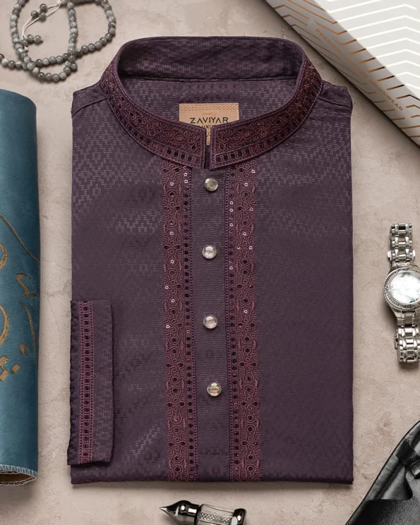 Product Description : Men’s regular fit panjabi with embroidered band collar. The front placket is lined with delicate embroidery and finished with decorative metal snap buttons. Matching cuffs with embroidery detailing. Crafted with rayon viscose fabric.
