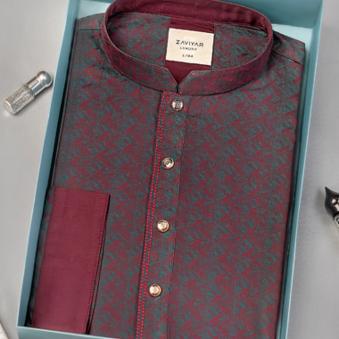 Men’s Jacquard Cotton regular fit panjabi. Band Collar. Band inside, button placket inside & sleeve cuff has contrast fabric details. Upper placket has decorative stitch & Button. Moon has cut & sew design. Long Sleeve. straight hem.