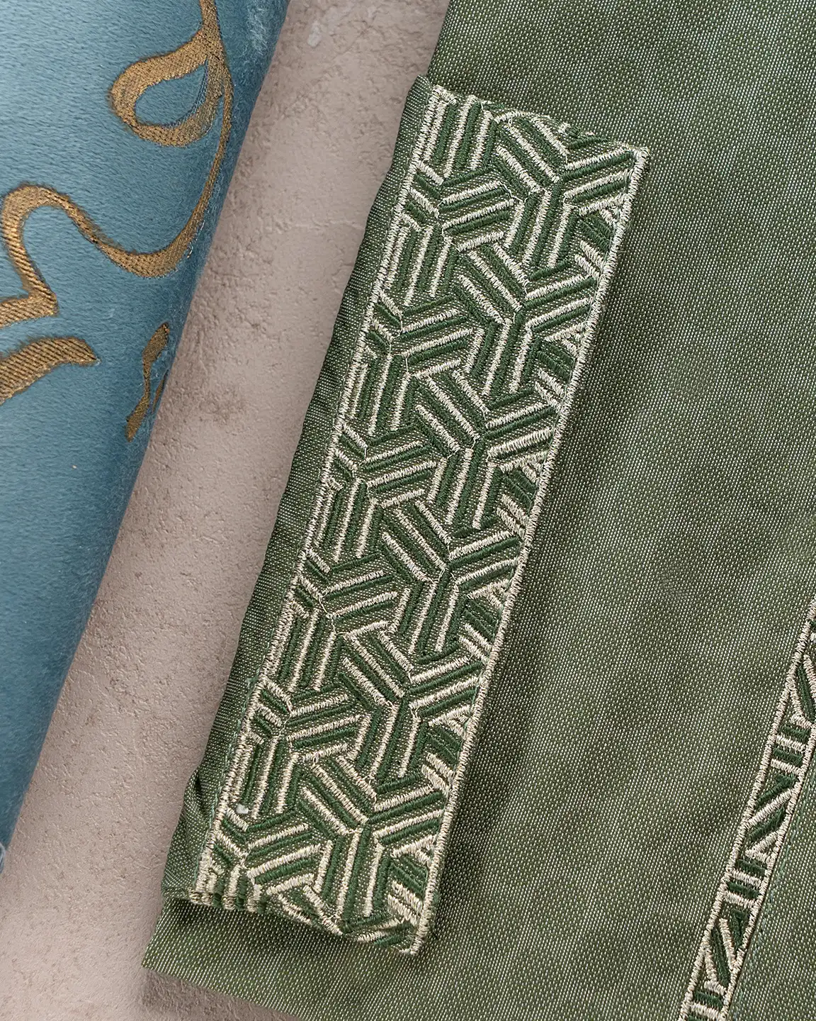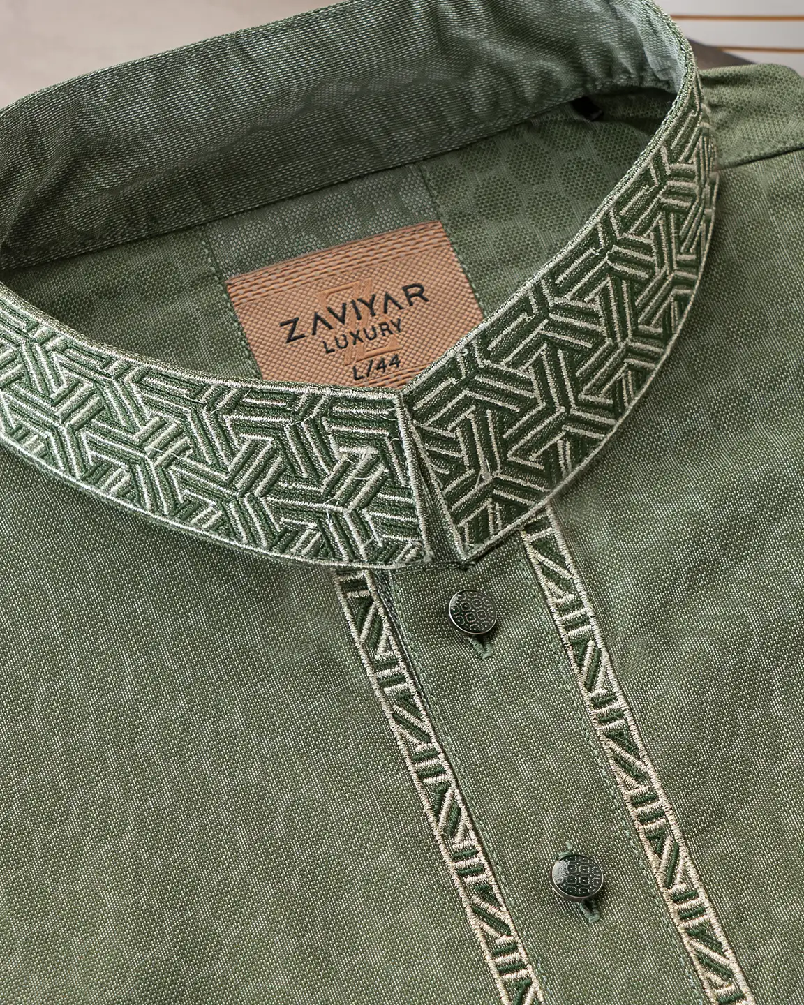 Product Description : Men’s regular fit panjabi with embroidered band collar. The front placket is lined with delicate embroidery and finished with decorative metal buttons. Matching cuffs with embroidery and button detailing. Crafted with jacquard cotton fabric.